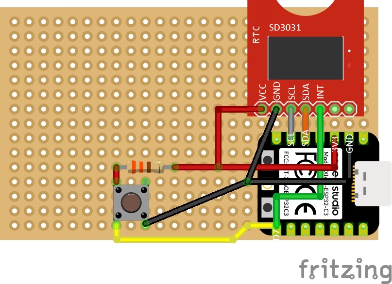 RTC(SD3031)INTピンはXIAO ESP32C3のD7ピンに接続されています。ここにタクトスイッチ、330Ω抵抗を通して3.3Vに接続してプルアップしておきます。タクトスイッチを押してオンにすると、D7ピンにかかっている電圧がGNDに落ちるため、RTCからのFALLINGと同様の信号を、D7ピンへ入力することができます。