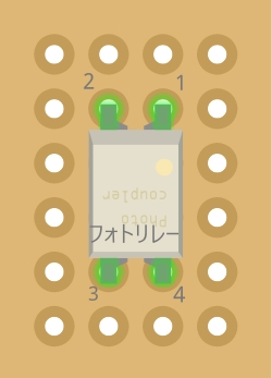フォトリレーの中にはLEDが入っていて、信号を受けて内部で光り、その光を受けて回路が開きます。LEDなので向きがあります。切り欠きのある方がLED側で、切り欠きを上にした時、右側が1で電源を、左側が2でGNDへ繋ぎます。3、4の接点側は極性はないですが、データシートの絵に合わせて4を電源側、3をGND側でつないでいます。