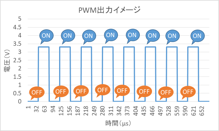 PWMは、Pulse Width Modulationの略です。ざっくり、信号のオンオフを繰り返し、パルス信号にすることで平均的な電圧を下げる、という理解で良さそうです。信号を受け取る機器(水中ポンプ)側からすると、ポンプは単純に短時間のオンオフを繰り返し受けている状態です。短いオンの間にモーターがちょっと動いて、オフになるけど、モーターは慣性で回っていて、停止する前に次のオン信号が来る感じですね。