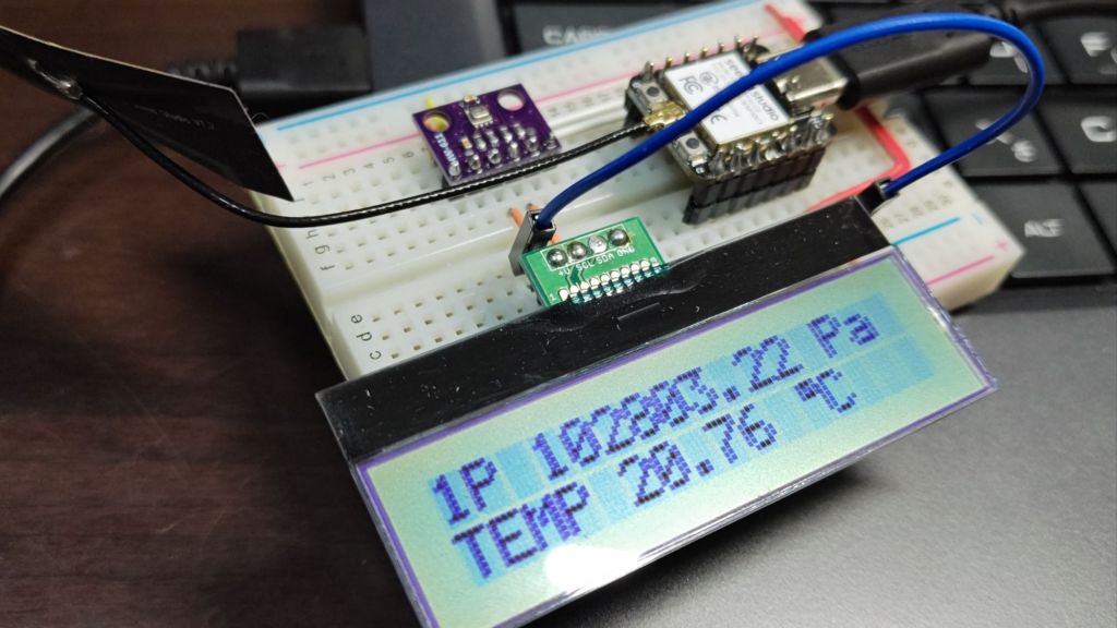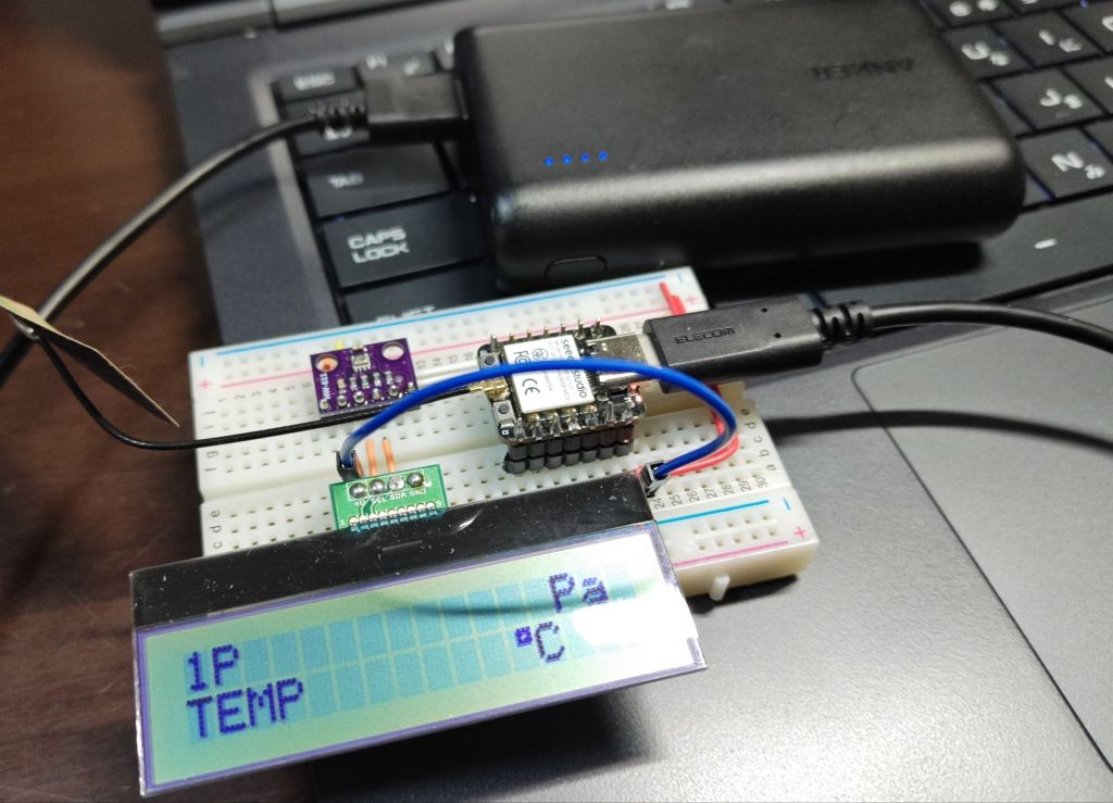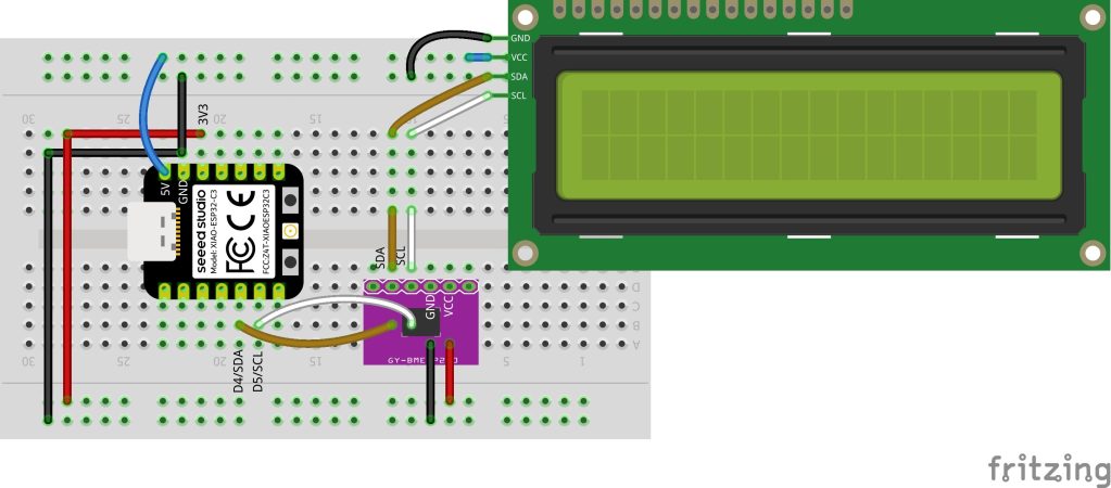 マイコンはXIAO ESP32C3を使っています。LCDはピッタリそのままのもののFritzingが見つからなかったので、1602でI2C接続のものを使っています。I2Cなので、SDAとSCLを気圧計BMP280のラインに繋げています。LCDの入力電圧が3.3Vでも行けるような感じで書いてありましたが、3.3Vでは起動しなかったのでXIAO ESP32C3の5Vから取ることにしました。どこかに設定があったのかな。