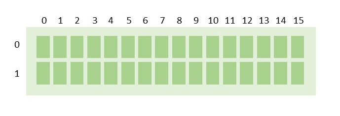 lcd上での表示位置は、列と行の番号で指定します。番号は下の図のように決まっています。左上隅が0行0列、右下隅が1行15列ですね。