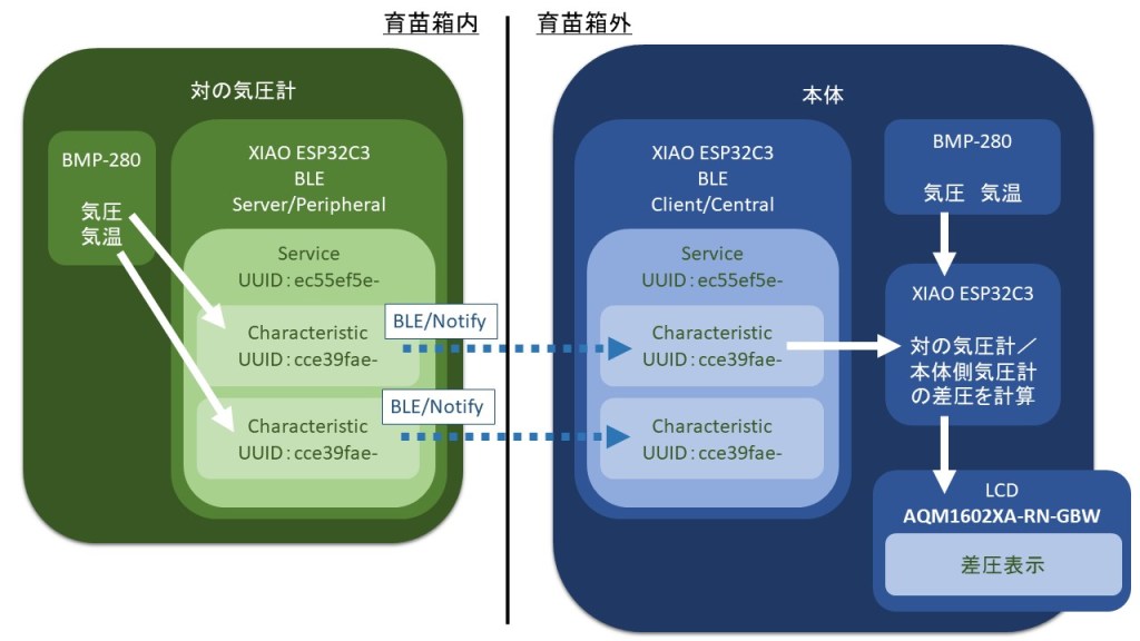 育苗箱内に対の気圧計を置き、気圧データをBLE接続で育苗箱外に置いてある本体に送信。本体は育苗箱外の気圧を測定しているので、BLEで送られてくる育苗箱内の気圧と自分で測定している育苗箱外の気圧データから差圧を計算、本体に設置しているLCDに差圧を表示。温度差は表示しないが、温度データも受け取る。